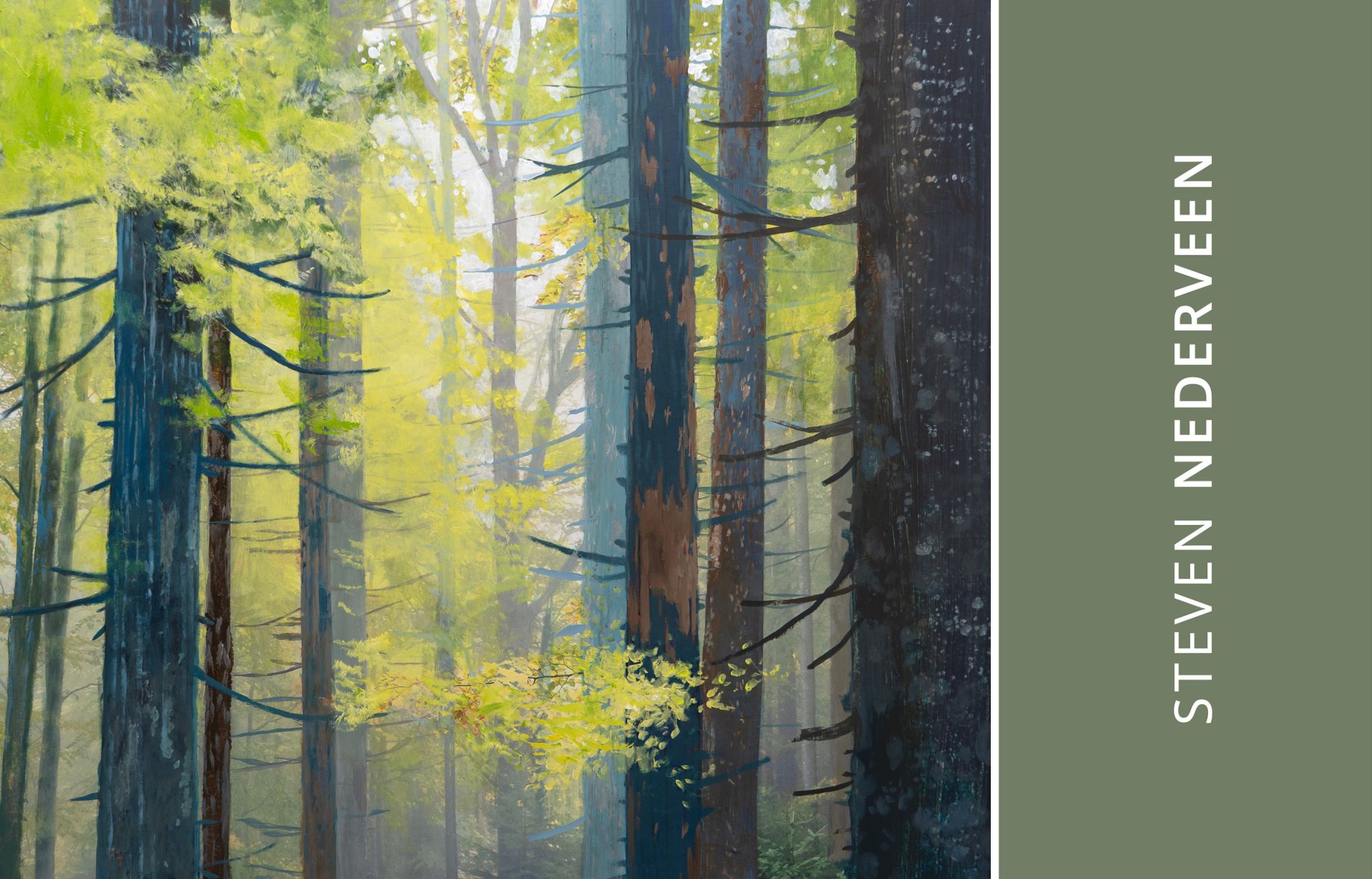 Steven Nederveen’s artwork has long been grounded in his meditation practice and influenced by the calming effect of immersion in his favorite places. He creates compositions of oceanic coastlines, panoramic landscapes, and old growth forests using heightened colors and high-contrast golden light. Highlighting the grandeur of the natural world, Nederveen’s artwork is achieved through a process that combines photography, painting, printing, and erasure; the resulting pieces allow us to imagine a space between reality and dream.