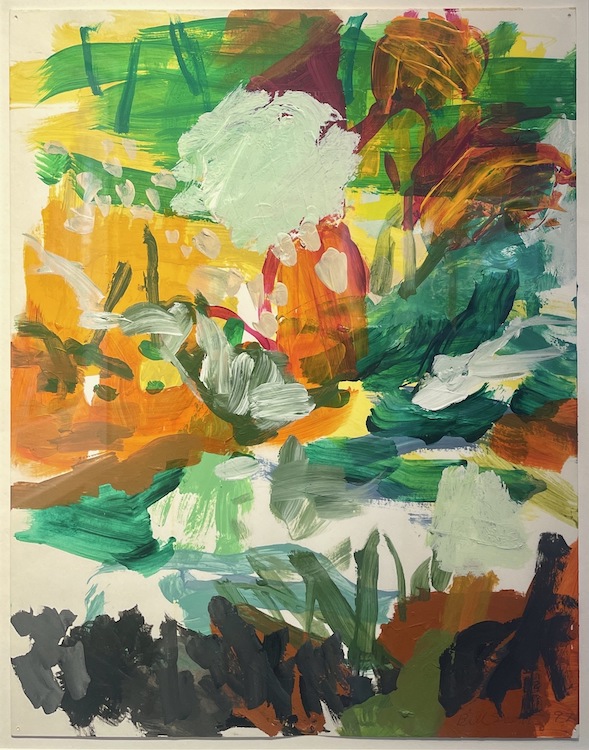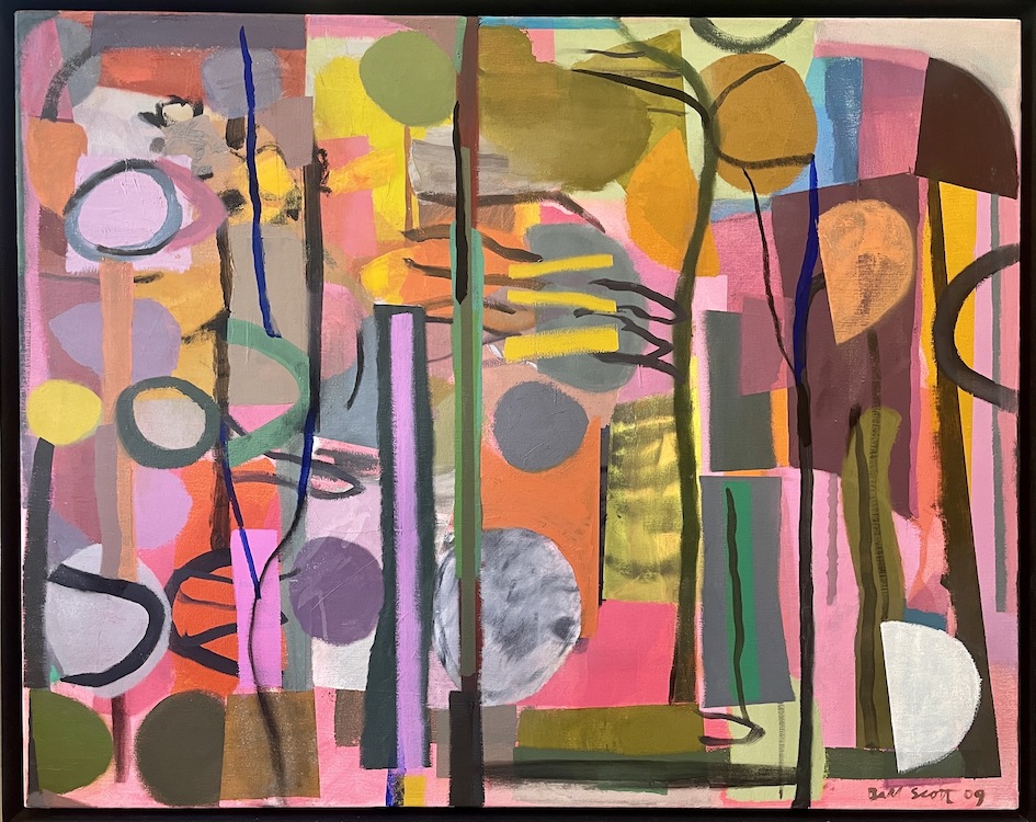 An expert colorist, Scott draws from nature and his own imagination, making paintings that complicate firm boundaries between the abstract and the representational. Although his canvases overflow with lush renderings of all flora and fauna, he has little interest in copying directly from nature. Instead, each painting is an offering of a perfect window view, an idealized garden, or a feeling evoked by the final days of a season. He is a painter of sensations and feeling rather than one of tangible realities, and his paintings are associative, where their titles hint at, without fleshing out, points of inspiration. Art historian Jason Rosenfeld has described Scott’s paintings as possessing a “peopled feeling,” (1) suggesting that there is a sincere, underlying humanism imbedded in Scott’s abstractions.