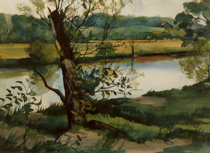 John McCoy was a brilliantly trained painter and a highly respected member of the Wyeth family and the Brandywine School.  He was formally trained at Cornell University, studied at the Beaux Arts School in Fontainbleau, France, after which noted artist-illustrator N.C. Wyeth privately tutored him.  A painter who embraces abstraction, realism, modernism, and tradition, John McCoy married N.C. Wyeth’s daughter, Ann Wyeth, and, until his death in 1989, they lived near the Wyeth family home at Chadds Ford, Pennsylvania.  In realist style, he painted the surrounding landscape and the coast of Maine where the family vacationed.  From 1946 to 1961, he taught at the Pennsylvania Academy of the Fine Arts in Philadelphia.