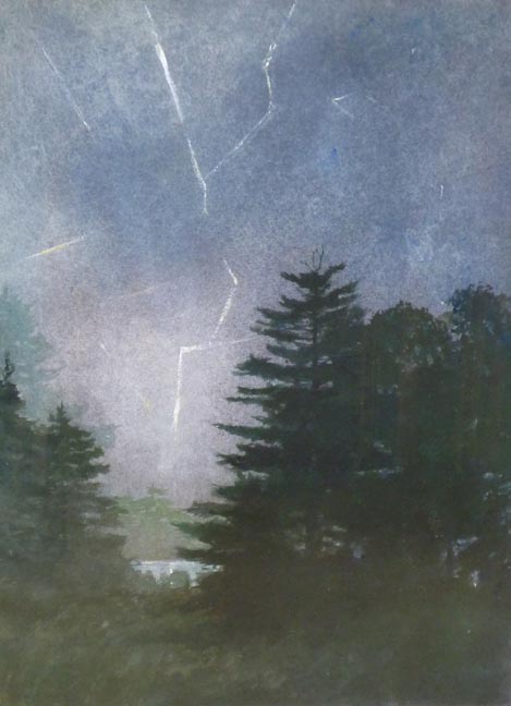McCoy captured the tranquil and brooding aspects of nature in his watercolor and mixed media paintings of the rocky coast and coves of Maine, along with the lush fields of moving grasses and wildflowers.  He also captured the beauty of the Brandywine River and the Pennsylvania countryside in his tempera and watercolor paintings.  By the 1950s, McCoy had also developed an interest in the Abstract Expressionists, particularly Jackson Pollock, and began experimenting with mixed media and pouring, dripping, and floating paint on canvas.  The book, John McCoy, an American Painter, by Anna B. McCoy, with commentary by Andrew Wyeth, tells of McCoy’s struggle for an independent creative voice and his determination to reduce painting to its essence.  Due to a tragic illness, John McCoy stopped painting in 1983.