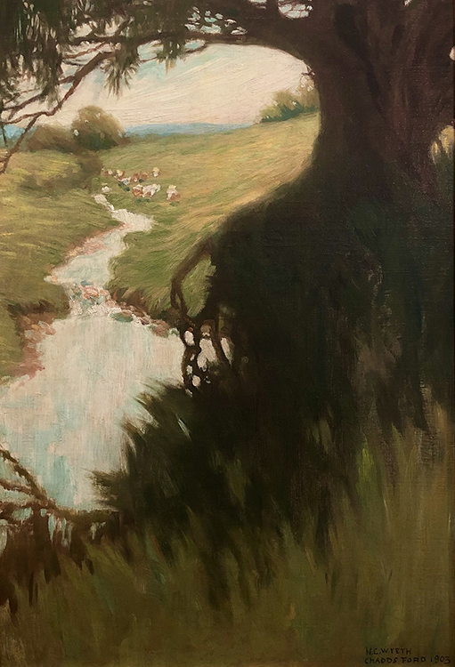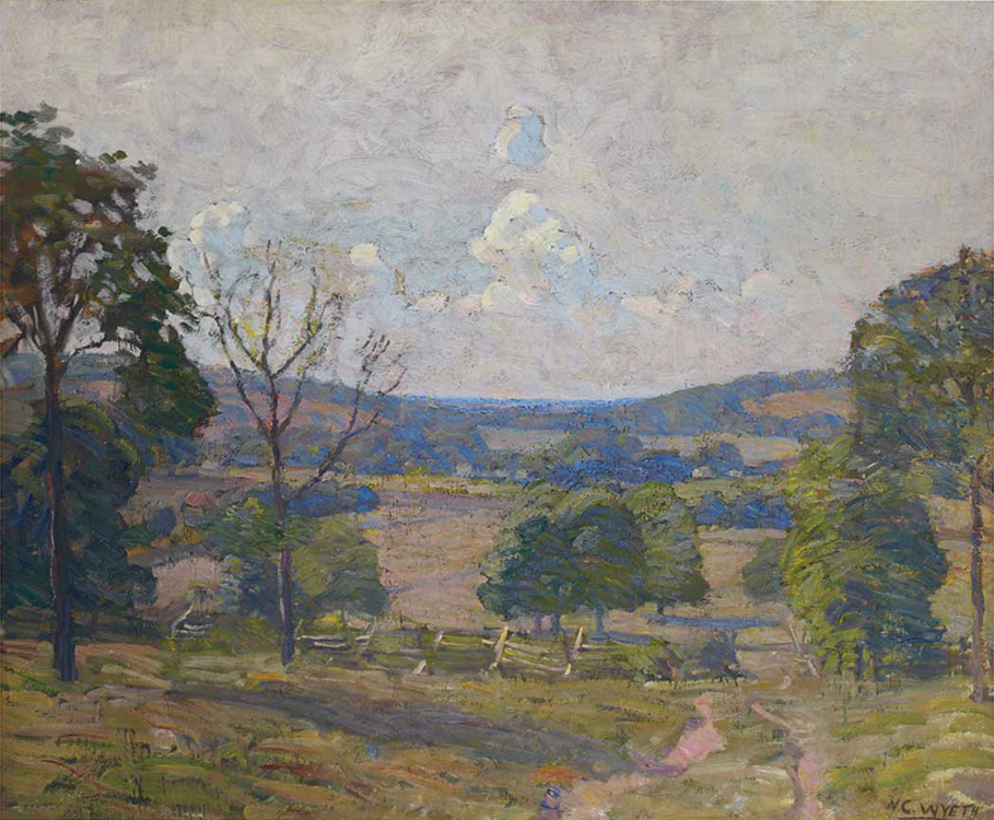 After his second trip west, Wyeth returned to Wilmington and married Carolyn Bockius on April 16, 1906. With marriage, his attention turned to the pastoral Chadds Ford countryside, a few miles from Wilmington in the heart of the Brandywine River Valley. There he purchased a house and raised his family. The rolling hills, planted fields, gentle brooks, and woodlands captivated his imagination. This softer landscape, in contrast to the rugged West, appears ad the background for many of his subsequent illustrations and the subject of many easel paintings.