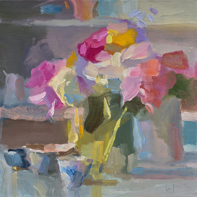 Christine Lafuente, Open Peonies and Cups, 2022, Oil on linen, 14 x 14 inches