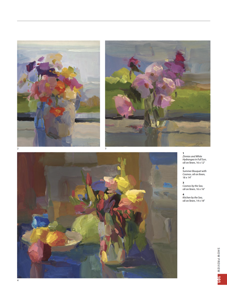 The paintings of Christine Lafuente are a culmination of all her past experiences, and her latest body of work is no exception. The Brooklyn, New York -based artist’s subject matter is diverse, working in land, sea and cityscapes, all of which have an influence on her current focus: still life. Her latest body of work, a group of floral still lifes bathed in natural light, are showcased in an upcoming exhibition at Somerville Manning Gallery…”