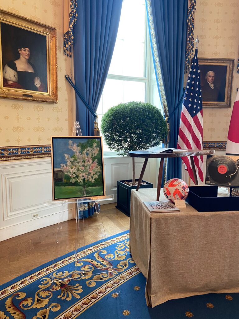 The week of April 9, 2024, President Biden and first lady Jill Biden welcomed Japanese Prime Minister Fumio Kishida and his wife, Yuko Kishida, to Washington, D.C. Jill Biden gifted Yuko Kishida a framed painting by Mary Page Evans of the Yoshino cherry tree that they planted together on the South Lawn of the White House in the Spring of 2023.