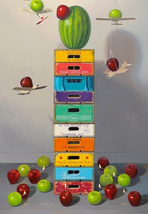 Another interesting feature of Jackson’s works is his use of colorful crates. Most still-lifes are set up on a table, but Jackson wanted to do away with this idea. Instead, he reaches out to American nostalgia, by using crates from the 1930s to 1970s that are all primary and secondary colors, adding vibrancy and life to the paintings. The crates also allow Jackson to put a form of text into a painting; many of them read “Pepsi” or “Pop Kola” or “Orange Crush.”