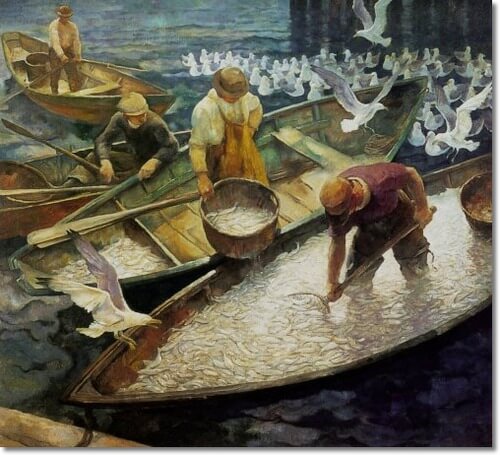 But as his son Andrew succeeded as a Realist artist in defiance of Modernist trends, the elder Wyeth felt trapped in the subsidiary profession of illustrator, and he grew to curse the commercial identity that pigeonholed him there, despite his attempts to escape. In “Lobsterman Hauling Trap Off Rocky Coastline” (1927) and “The Drowning,” we see him adopting Cubist ideas, fragmenting his imagery while preserving its narrative impact. “Dark Harbor Fishermen” (1943) is a late work that evokes North-European Renaissance painting even in its medium and support, egg tempera on panel. Viewed from a pier above them, four anonymous fishermen in rowboats, their faces hidden beneath hats, unload their day’s catch. It is a virtuoso representation of moonlight reflecting off the cold, wet swath of silvery fish and imparting an almost angelic white glow to the hungry gulls hovering about.